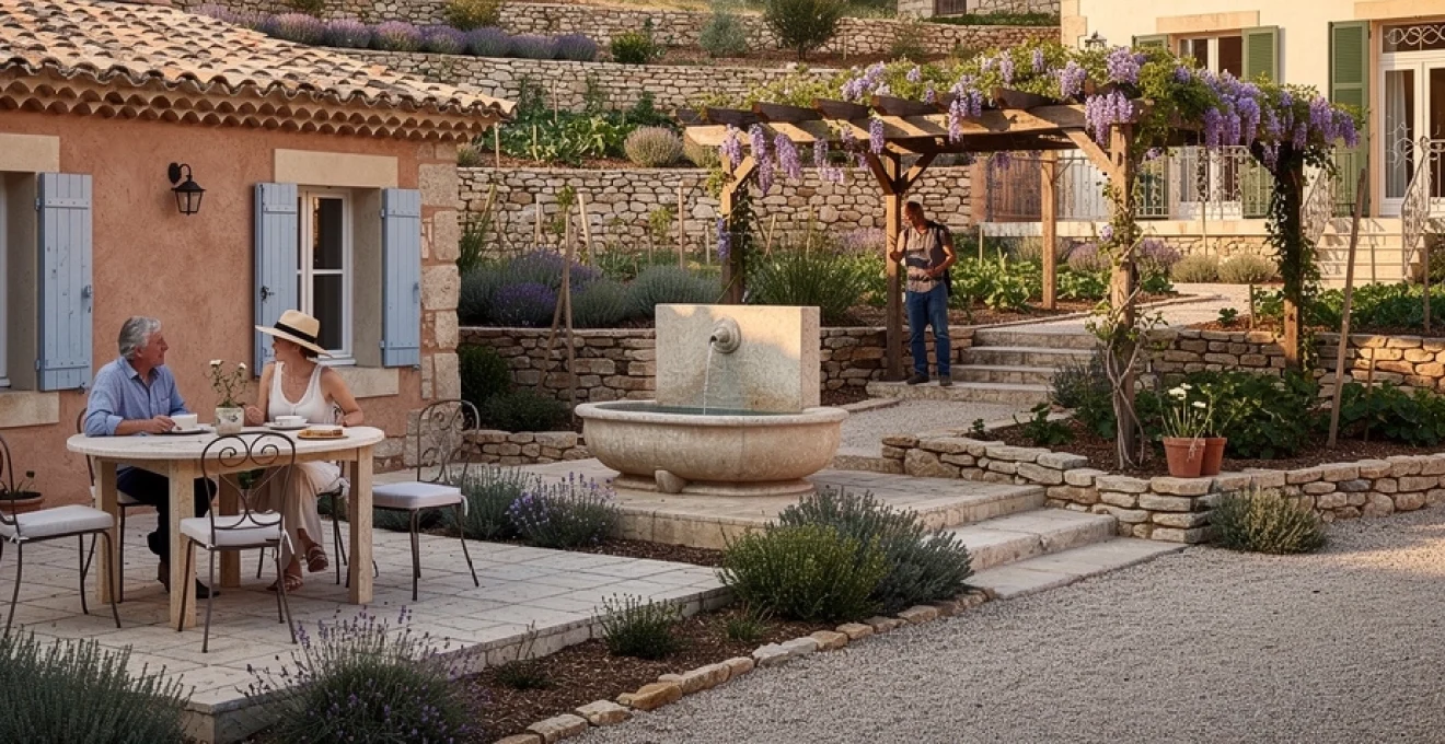Au-delà de l’architecture elle-même, les maisons provençales tirent une grande partie de leur charme de leurs aménagements extérieurs. Restanques en pierre sèche, bassins, treilles couvertes de glycines ou de vignes, allées bordées de lavandes : ces éléments paysagers ne sont pas de simples décors, mais répondent à des fonctions bien précises, liées à l’eau, à l’ombre et à la culture du sol. Ils prolongent la maison vers le jardin et participent pleinement de l’art de vivre méditerranéen, où l’on passe une grande partie de l’année dehors.